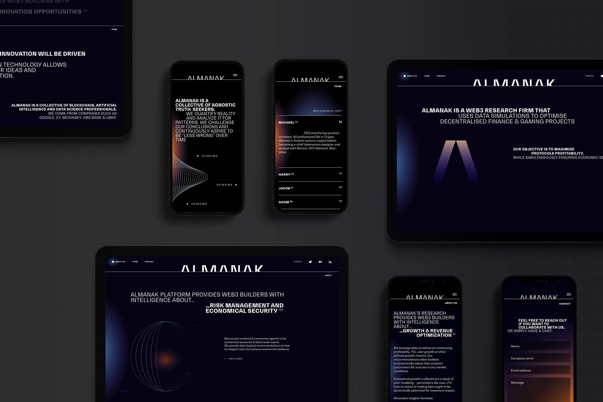 We were responsible for creating both, offline and online presence for Almanak, a management platform that uses data analysis to generate simulations and predictions for the cryptocurrency market in the Web3.
